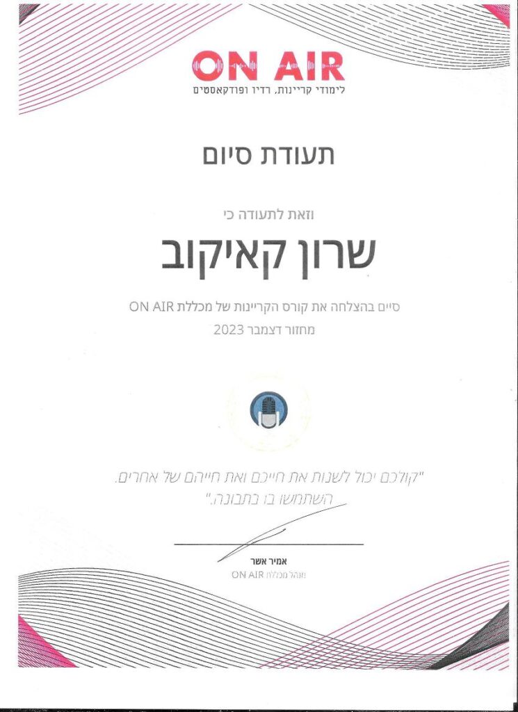 נעים מאוד, אני שרון קאיקוב, קריין מקצועי עם מעל 30 שנות ניסיון בתחום הקריינות והפקות הקול. המסע שלי בעולם הקול והקריינות התחיל ממש במקרה, אי שם בשנת 1993. באותה תקופה עבדתי כאיש הגברה בתצוגות אופנה, ובאחד האירועים נדרשתי להחליף את מנחה התצוגה ברגע האחרון. למרות החשש, נכנסתי לתפקיד במהירות, האירוע זכה להצלחה גדולה – ומאז הכל היסטוריה.